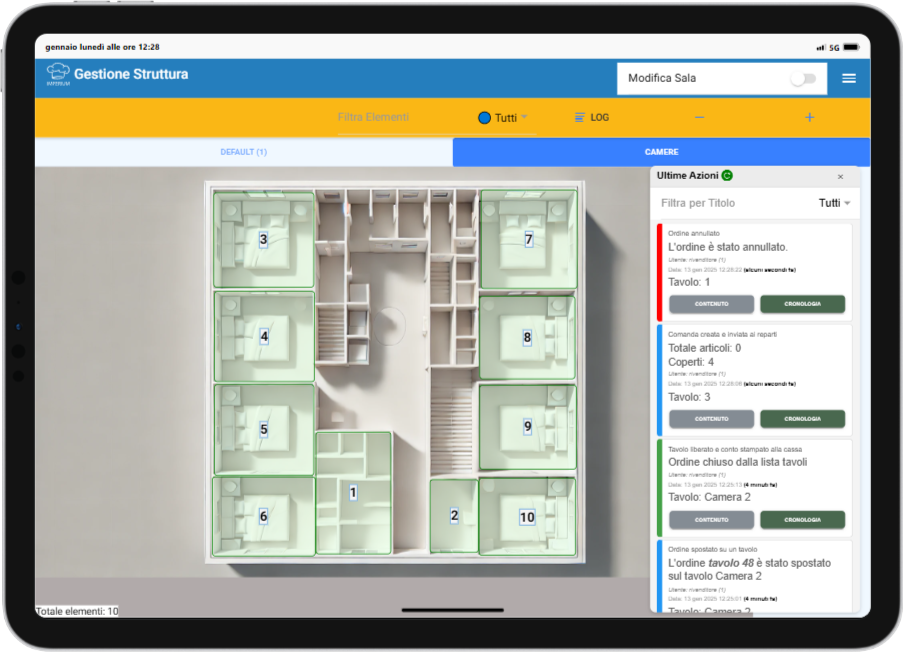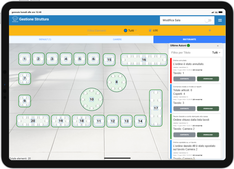 - Tieni traccia di ogni azione con il log dettagliato: dai cambi di stato degli ordini alle modifiche effettuate su tavoli o postazioni.