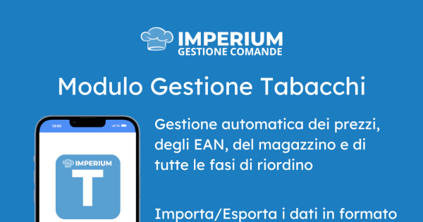 Nel mondo del commercio al dettaglio, la gestione efficiente del magazzino è essenziale per garantire la disponibilità costante dei prodotti e soddisfare le esigenze dei clienti. Per i rivenditori di tabacchi, questo processo può essere particolarmente complesso a causa della necessità di aggiornare frequentemente i prezzi, monitorare le giacenze e gestire i riordini. Per rispondere a queste sfide, siamo entusiasti di annunciare il lancio del nostro nuovo modulo "Gestione Tabacchi" di IMPERIUM, disponibile senza costi aggiuntivi per tutti i nostri partner.